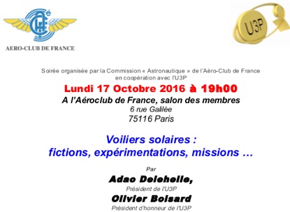 ◦ 17 octobre : conférence à l’Aéro-Club de France, ouverte au public sur inscription. Participation d’une quarantaine de personnes. Cette conférence a été mentionnée sur le site d’Air & Cosmos.